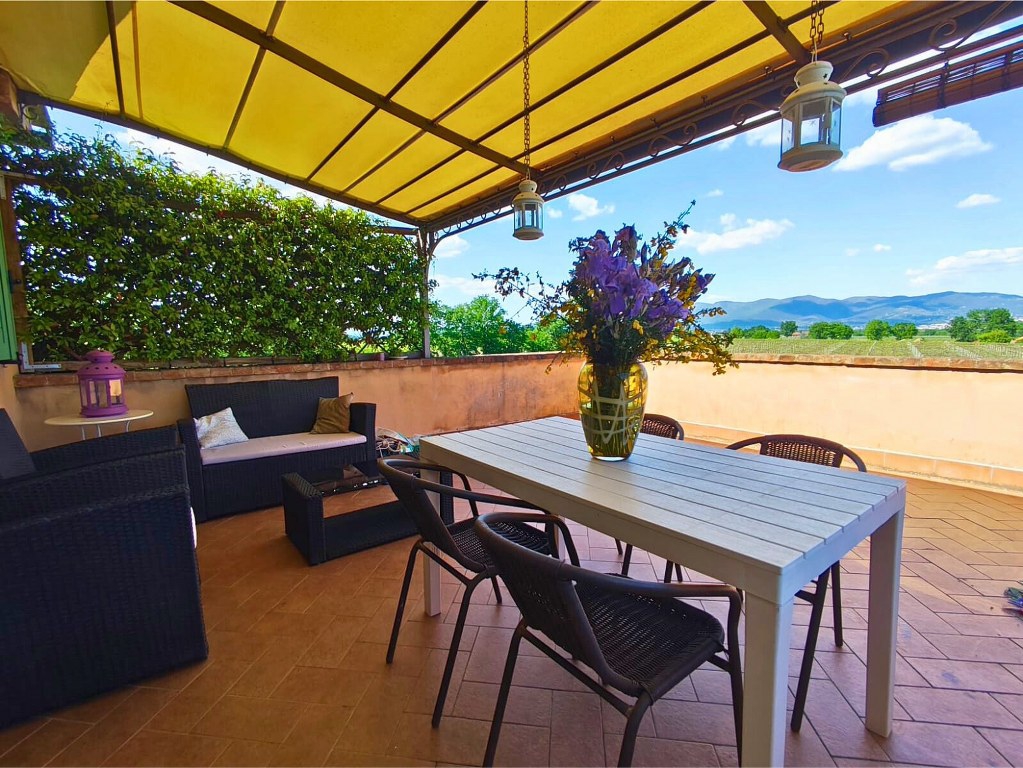Dal terrazzo e dal giardino si godono splendide viste sulle colline e sui borghi storici di Castiglion Fiorentino, Cortona e sul Castello di Montecchio.