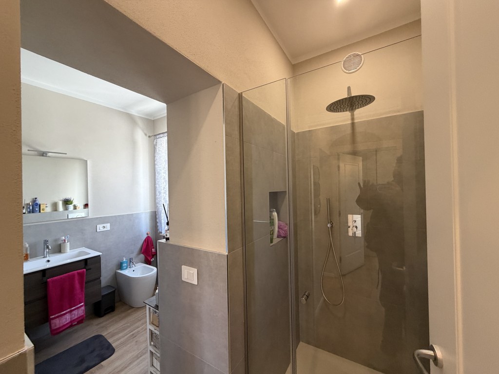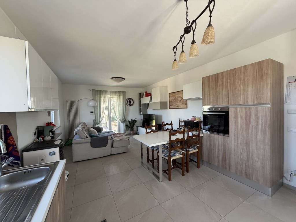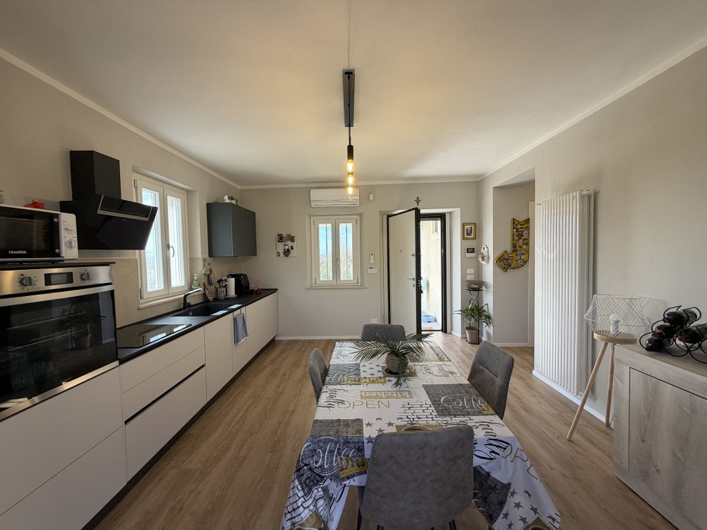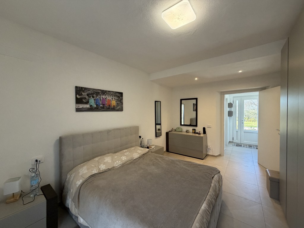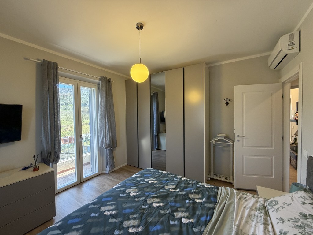 L’appartamento al primo piano è accessibile tramite una scala esterna che conduce a una graziosa terrazza, perfetta per colazioni rilassanti con vista sul giardino e sugli ulivi. L’ingresso si apre su una spaziosa cucina con zona pranzo e porte finestre che conducono a un balcone con vista sul vialetto. Ancora, troviamo un luminoso soggiorno, con ampia vetrata, bagno di servizio con lavanderia, una camera matrimoniale con balcone, bagno principale ed una seconda camera da letto.