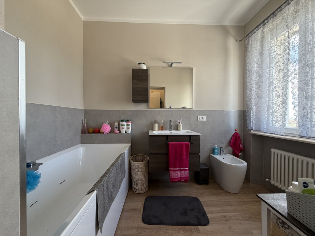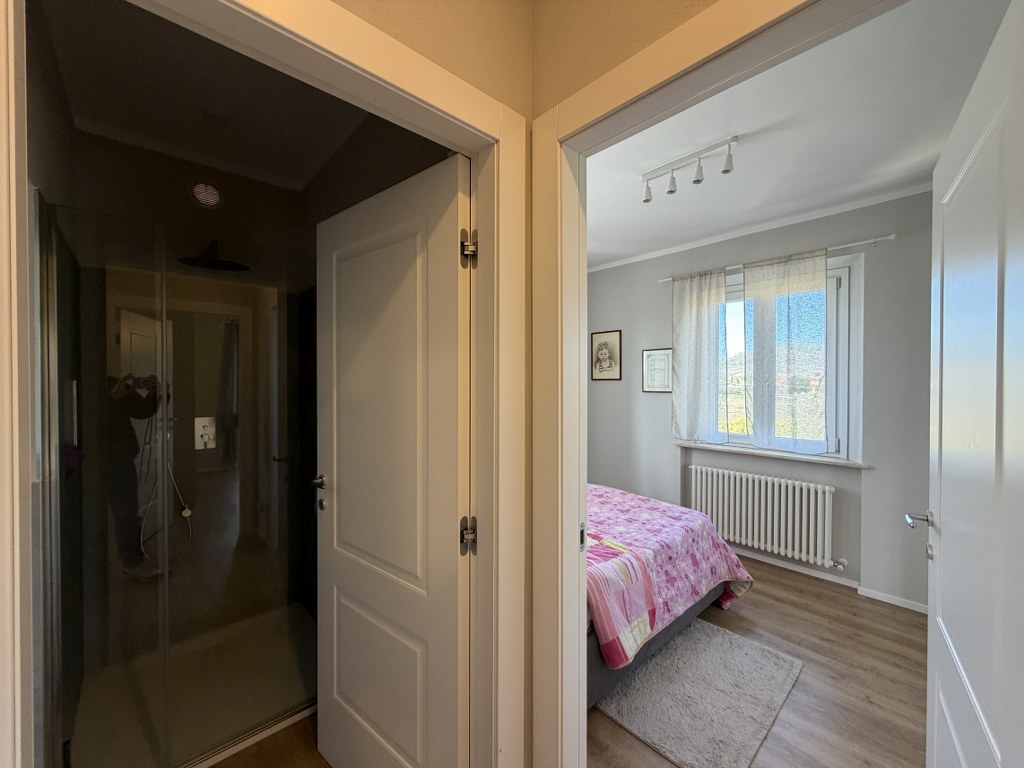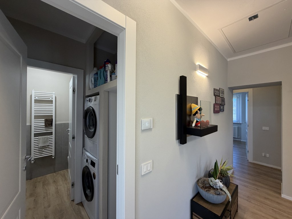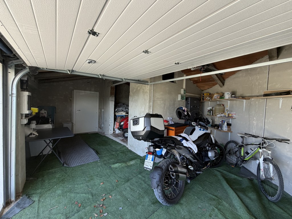 Un ampio garage ospita la caldaia a pellet, la lavanderia e spazi di deposito, oltre a un ulteriore ambiente che può essere integrato nella casa una volta unificati i due appartamenti.