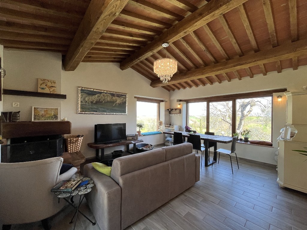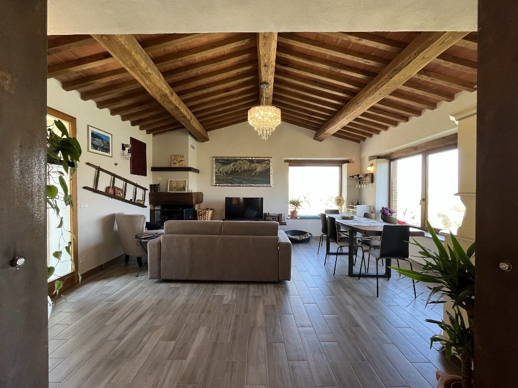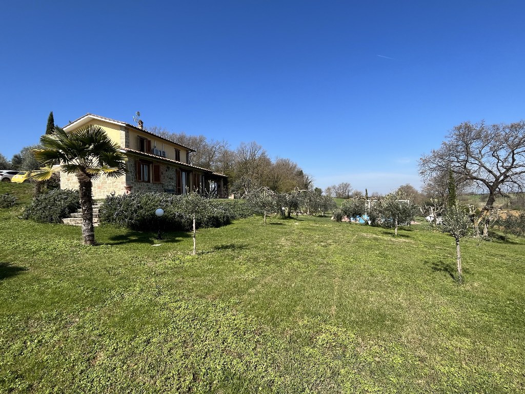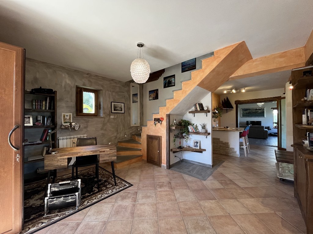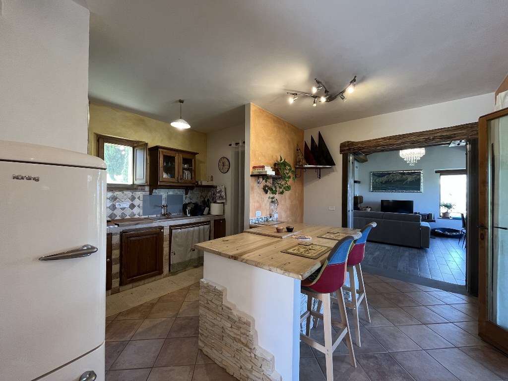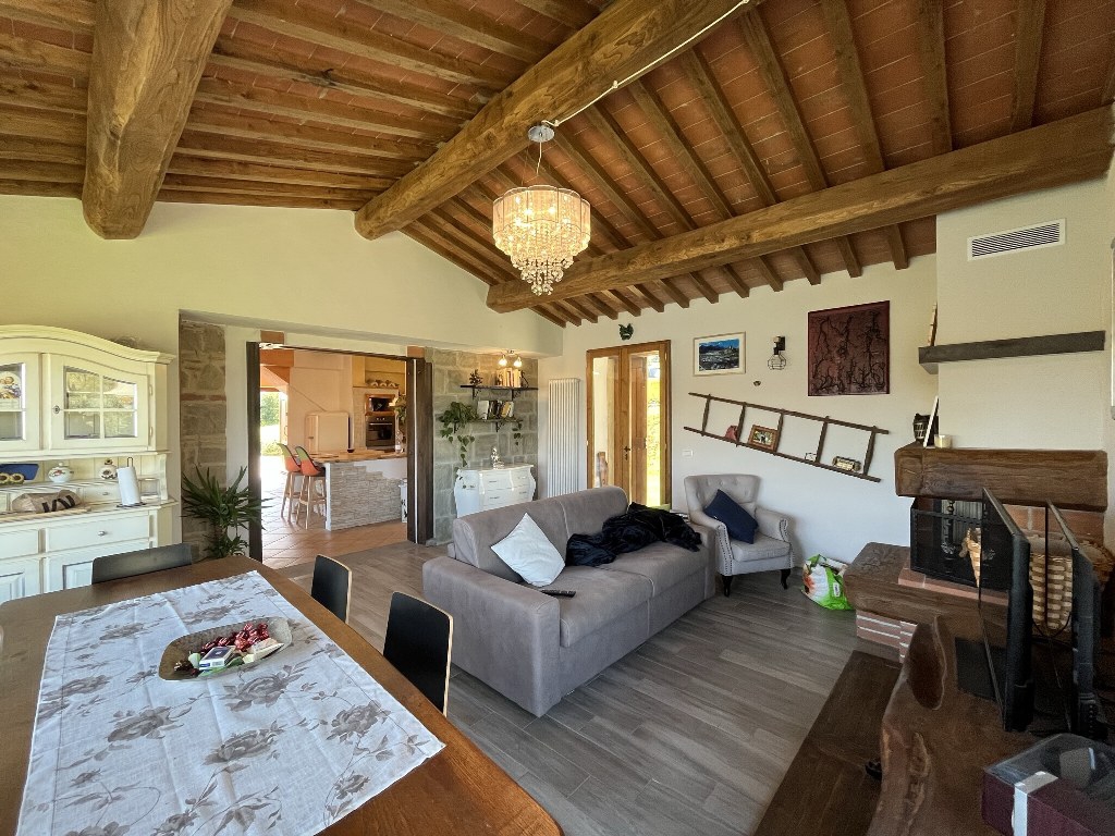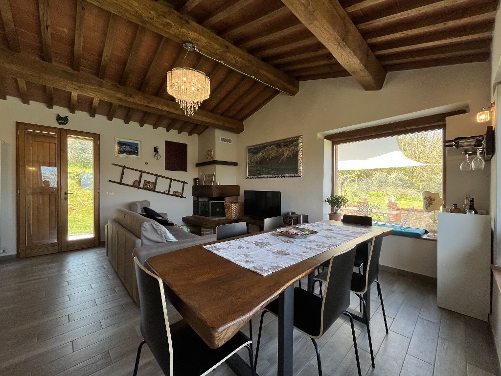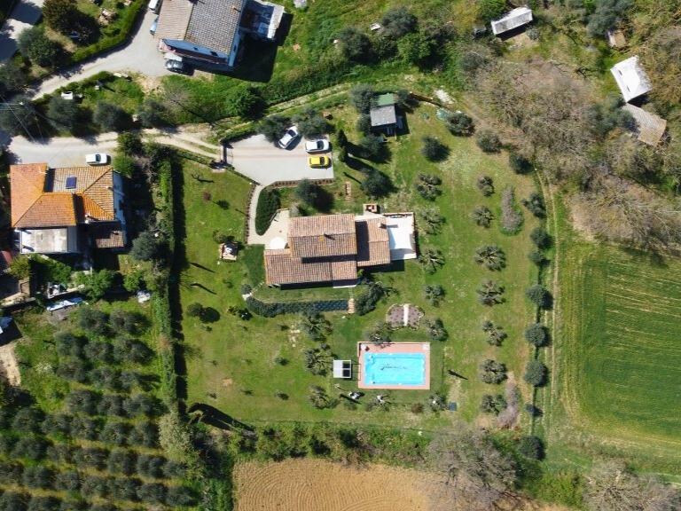 Il cuore della casa è la zona giorno a piano terra: una cucina completamente attrezzata con dispensa, collegata direttamente a una splendida area pranzo esterna coperta, perfetta per colazioni all’aperto e cene estive con vista sulla campagna. Il soggiorno, ampio e luminoso, è impreziosito da un camino e da grandi aperture che si affacciano sul giardino e sulla piscina.