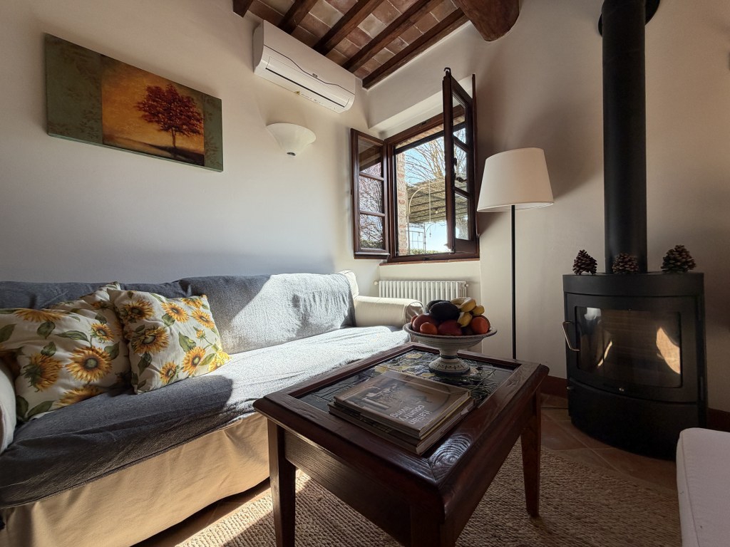 Dal giardino si accede direttamente alla zona giorno composta da un accogliente soggiorno con cucina open space. Questo ambiente è il vero cuore della casa: caldo, conviviale e luminoso. La presenza della stufa a legna contribuisce a creare un'atmosfera particolarmente piacevole durante i mesi più freddi.