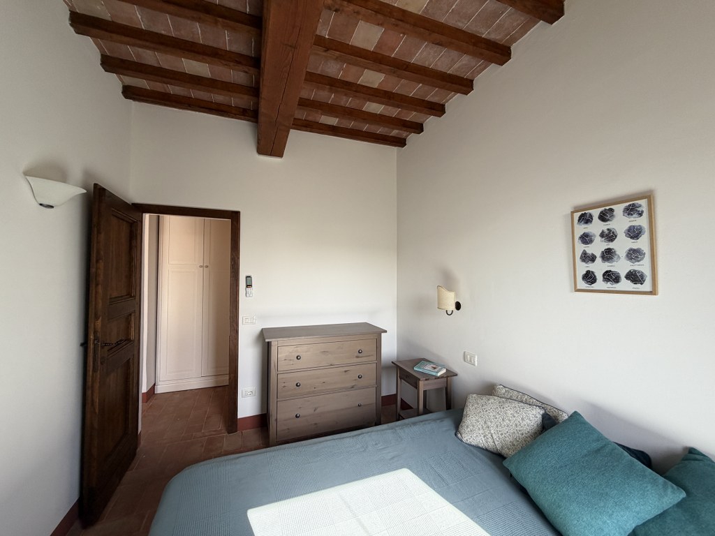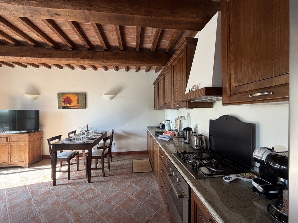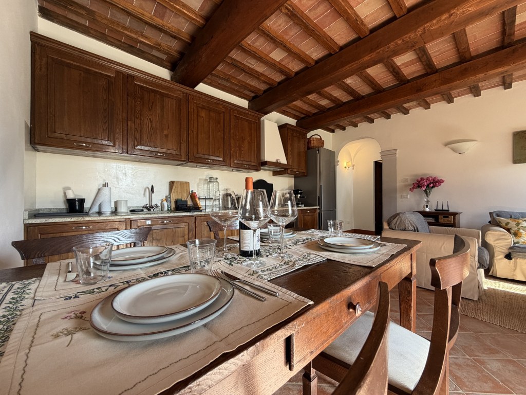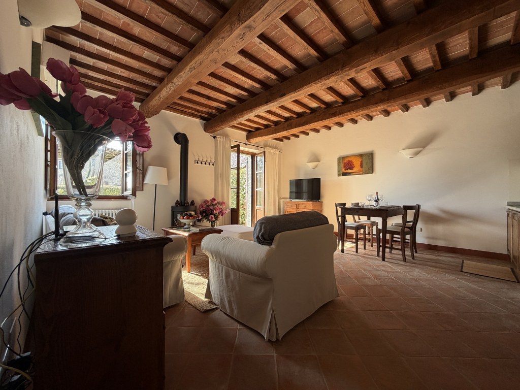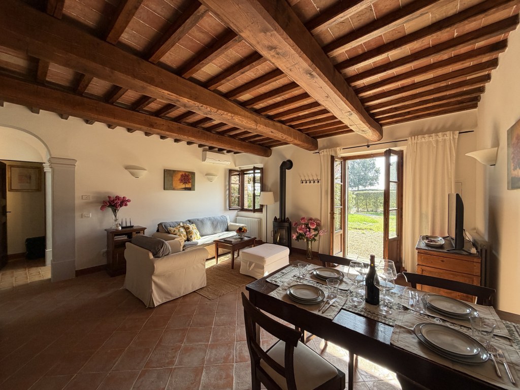 All'interno dello spazio principale troviamo un'area living dedicata al relax e una zona pranzo ideale per cene con amici o familiari. L'ambiente è caratterizzato da soffitti con travi a vista e pavimenti in cotto che conferiscono alla casa il classico fascino delle abitazioni toscane.