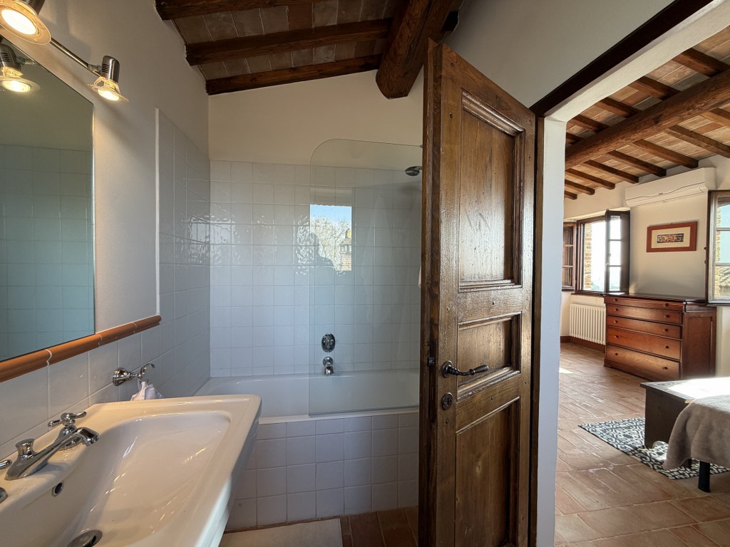 Salendo al primo piano troviamo la zona notte composta da due camere da letto entrambe con piacevoli affacci sul giardino privato e sulla campagna circostante. Su questo piano è presente anche un bagno completo con doccia, oltre a un pratico armadio multiuso che integra una zona lavanderia ben organizzata.
