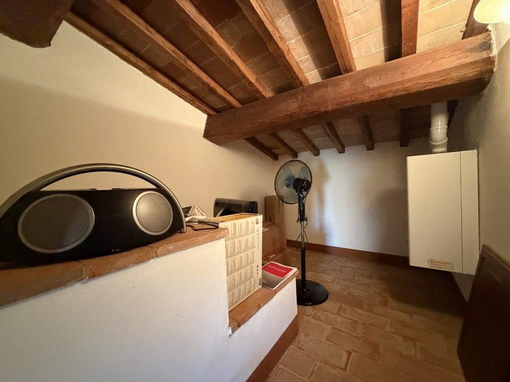 L'ultimo livello della casa ospita la camera padronale, uno spazio ampio e riservato che rappresenta una vera e propria suite privata. Qui troviamo un bagno privato e affacci particolarmente suggestivi sul paesaggio circostante. Sempre a questo piano è presente anche un locale utilizzato come rimessa o locale tecnico, dove si trova la caldaia e che offre ulteriore spazio di servizio.