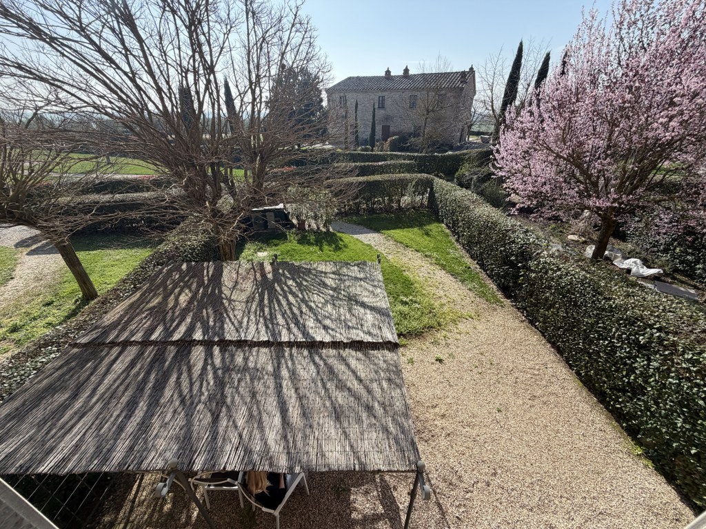 L'ingresso principale avviene attraverso il giardino privato, uno spazio curato e riservato che rappresenta un'estensione naturale della casa. Qui troviamo una piacevole pergola che permette di organizzare una zona pranzo esterna, perfetta per godere delle lunghe serate estive e della tranquillità della campagna.